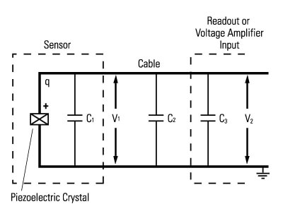 這些電壓模式系統(tǒng)的示意圖包括傳感器,電纜和電壓放大器或讀出設備的輸入電容,如圖2所示。絕緣電阻(信號和地之間的電阻)假設很大(> 10 12歐姆)和因此未在原理圖中示出。